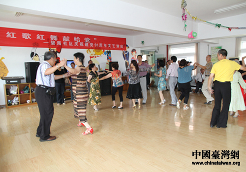 參觀中,臺灣嘉賓隨性地與社區居民跳起舞蹈,進行親切交流。(貴陽市臺辦 王康 攝)