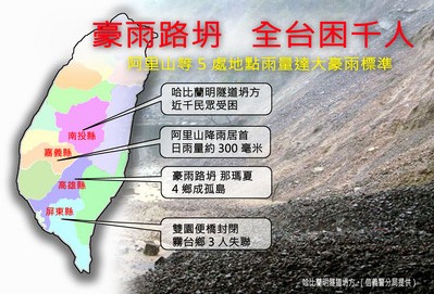 據臺灣“今日新聞”報道,臺灣梅雨鋒面發威,一整夜降下大豪雨,讓嘉義縣阿里山區累積雨量高達308毫米,造成山坡土石松動,大石頭從山頂滾落下來,把兩線道縮成一線道;另外,129線道通往新美、茶山和山美村路段便橋被大水沖毀,1000人受困等待救援。