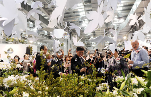 2011洲際杯花藝競賽19日在花博爭艷館登場,由臺灣百名花藝老師精心制作的“花之蝶舞”,在開幕式中吸引眾人目光,盼透過象征“福氣”的蝴蝶,為世界祈福。 圖片來源:“中央社”