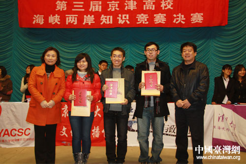 “你好臺灣”杯第三屆京津高校海峽兩岸知識大賽歷時一個多月,經過激烈比賽,宣告圓滿閉幕。自2011年11月初初賽以來,大賽共吸引了4000余兩岸青年學生參與其中。經過多輪比賽,最終進入決賽的七支隊伍分別是南開大學兩岸交流協會、北京大學臺灣研究會、清華大學學生海峽兩岸交流協會、北京交通大學兩岸青年交流協會、北京林業大學閩臺文化傳播協會、中國人民大學港澳臺交流發展協會、北京師范大學“形勢與政策”小組。最終,中國人民大學港澳臺交流發展協會的選手憑借出色表現奪得了冠軍。(記者 郜利敏)