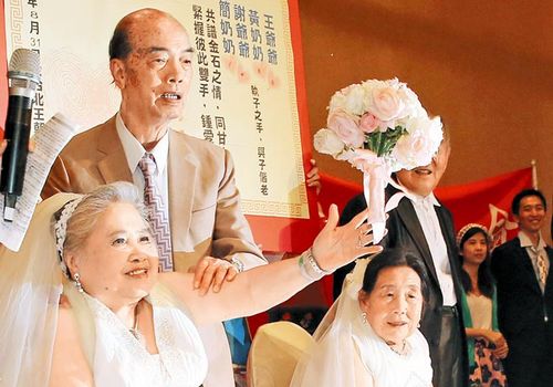 兩對超過50年的長輩舉辦“世紀(jì)婚禮”,高齡8旬的謝爺爺與老伴簡奶奶做到“執(zhí)子之手、與子偕老”的愛情見證,簡奶奶并拋出手中鮮花繡球給現(xiàn)場未婚女性。圖片來源:臺灣《中國時報》