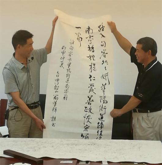 圖為前新北市瑞芳區區長(右)賦詩贈予句容市華陽街道南亭村。