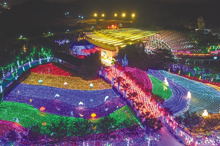 1月4日晚,航拍三亞水稻國家公園7D光影樂園。歷經100天精心打造,三亞水稻國家公園7D光影樂園日前與市民游客見面。在近千畝的光影游玩體驗區中,5000萬顆燈珠、20萬米燈線、35組大小燈組呈現出七大主題31個元素燈展,為市民游客帶來一場視覺盛宴。