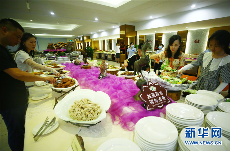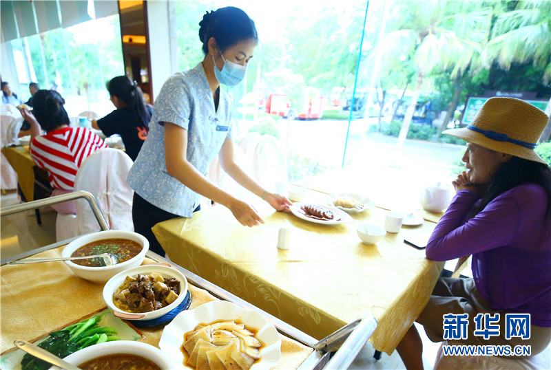 8月12日,游客在三亞南山文化旅游區緣起樓素齋自助餐廳取餐。新華網發(陳文武攝)