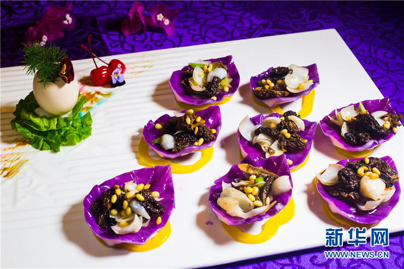 近日,三亞南山新推出用野生羊肚菌和鮮百合制作的名為“紫氣東來”素菜。新華網發(陳文武攝)