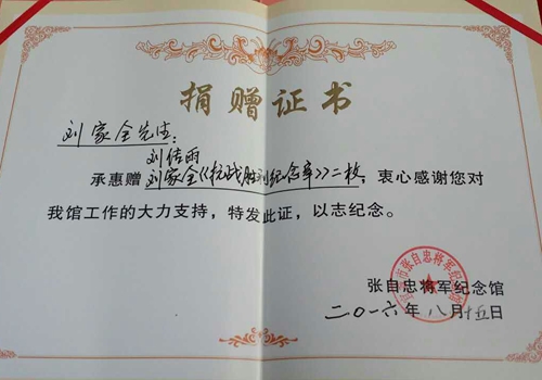 劉傳雨,宜城市鄭集鎮(zhèn)人,1940年參加國(guó)民黨軍隊(duì),曾參加長(zhǎng)沙第二次、第三次會(huì)戰(zhàn),在長(zhǎng)沙第三次會(huì)戰(zhàn)中為國(guó)捐軀。劉家全,1944年10月參加國(guó)民黨軍隊(duì),1945年2至4月參與鄂北會(huì)戰(zhàn),后隨國(guó)民黨軍隊(duì)到臺(tái)灣。2015年7月7日,劉傳雨、劉家全父子同獲臺(tái)灣地區(qū)領(lǐng)導(dǎo)人頒發(fā)的《抗戰(zhàn)勝利紀(jì)念章》各一枚。劉家全今年85歲,獲頒《抗戰(zhàn)勝利紀(jì)念章》后,劉先生萌生了將《抗戰(zhàn)勝利紀(jì)念章》捐贈(zèng)給家鄉(xiāng)的張自忠將軍紀(jì)念館的愿望。今年8月,其兒子來大陸,劉先生將兩枚《抗戰(zhàn)勝利紀(jì)念章》交給其兒子,帶給其侄兒劉正忠,讓侄兒捐贈(zèng)給張自忠將軍紀(jì)念館。張自忠將軍紀(jì)念館為劉氏父子頒發(fā)了榮譽(yù)證書。(中國(guó)臺(tái)灣網(wǎng)宜城市通訊員 何家明)