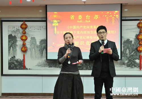 中國臺灣網1月25日武漢訊 新年伊始,氣象更新,在喜迎新春佳節的日子里,為深入學習貫徹黨的十八屆六中全會精神,推進機關精神文明建設和文化建設,元月24日下午,省委臺辦舉辦了一場寓政治性、知識性、娛樂性于一體別開生面的《關于新形勢下黨內政治生活若干準則》《中國共產黨問責條例》和《中國共產黨黨內監督條例》知識競賽暨迎新春職工聯歡活動。