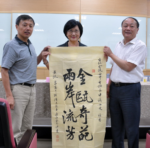 裴高才(左)佀治洪(右)贈童中儀“金甌奇葩,兩岸流芳”