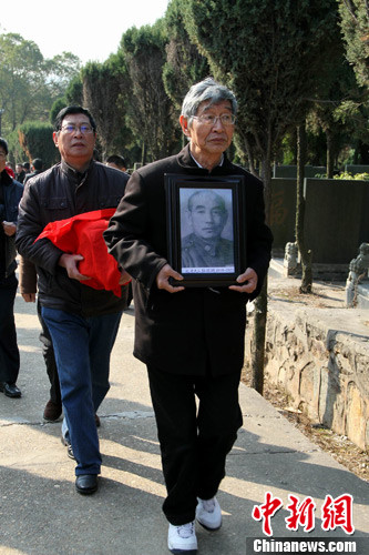12月12日,江西南昌城郊的瓊山墓區,78歲的杜及峰手捧父親的遺像,62歲的杜耀忠手捧父親的骨灰甕,攜杜家四代30多位后人,來到母親墓前。中新社發 劉占昆 攝