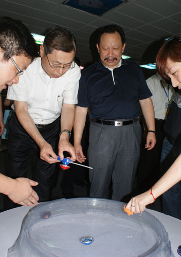 ;鶗倍麻L高孔廉 (左2)試玩杭州中南卡通創作卡通陀螺周邊商品。圖片來源:“中央社”
