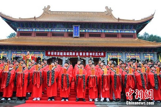 “辛卯年清明海峽兩岸共祭炎帝神農(nóng)氏大典”4月3日在中華始祖炎帝安寢地湖南株洲炎帝陵舉行,參加第二屆“在臺(tái)湘籍后裔湖南行”活動(dòng)的臺(tái)灣鄉(xiāng)親及社會(huì)各界人士共200多人祭拜炎帝神農(nóng)氏。圖為千人頌唱《祭炎帝》。中新社發(fā)劉柱 攝