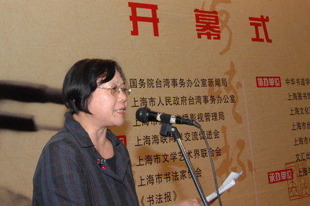 上海海峽兩岸交流促進(jìn)會(huì)會(huì)長(zhǎng)趙雅君主持了開幕式。本屆大展由國(guó)務(wù)院臺(tái)灣事務(wù)辦公室新聞局為顧問單位,上海市人民政府臺(tái)灣事務(wù)辦公室、上海市文化廣播影視管理局為指導(dǎo)單位,上海海峽兩岸交流促進(jìn)會(huì)、上海市文聯(lián)、上海市書協(xié)、《書法報(bào)》、中國(guó)臺(tái)灣網(wǎng)主辦,中華書道學(xué)會(huì)(臺(tái)灣)、上海市臺(tái)聯(lián)、上海文化聯(lián)誼會(huì)、上海市臺(tái)灣同胞投資企業(yè)協(xié)會(huì)、上海圖書館、文匯出版社協(xié)辦,上海與臺(tái)灣網(wǎng)承辦。