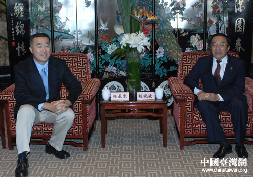 中共上海市委常委楊曉渡會見出席論壇的臺灣104人力銀行董事長楊基寬先生。(上海市臺辦 葛鳳章 攝)