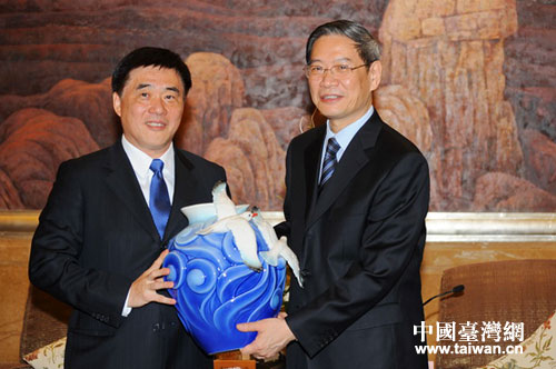 中共中央臺辦、國務(wù)院臺辦主任張志軍7月2日在上海會見了前來出席“2013上海臺北城市論壇”的臺北市長郝龍斌一行。(上海市臺辦常志康 攝)