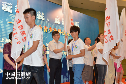 與會嘉賓向參加此次夏令營活動的各校學生代表授營旗。(上海市臺辦 葛鳳章 攝)