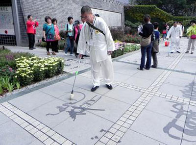 臺(tái)北花博會(huì),陜西西安6位民眾組成“輕描淡寫”書寫團(tuán),正在西安展園用地書筆蘸清水,在地面進(jìn)行書法書寫,除了低碳又環(huán)保,還能鍛煉身體。圖片來源:“中央社”