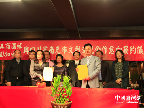 南充市文化創(chuàng)意訪問(wèn)團(tuán)與臺(tái)灣“圓加資產(chǎn)有限公司”公司簽約儀式。圖片來(lái)源:南充市臺(tái)辦