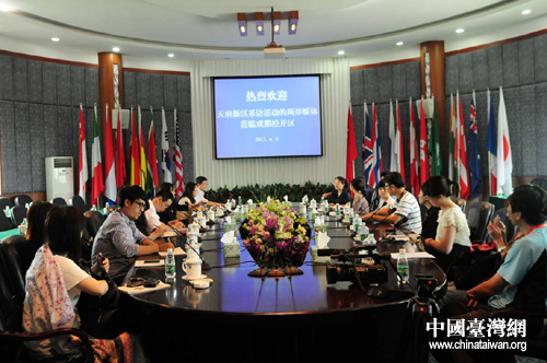 參加天府新區采訪活動的兩岸媒體記者在成都經濟技術開發區座談采訪。(圖片來源:四川省臺辦)