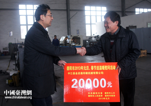 中國(guó)臺(tái)灣網(wǎng)1月28日德陽(yáng)消息 日前,四川省德陽(yáng)市撥出專(zhuān)款,對(duì)全市困難臺(tái)資企業(yè)和困難臺(tái)胞臺(tái)屬進(jìn)行了“送溫暖”慰問(wèn)活動(dòng),給企業(yè)送去了慰問(wèn)金,給臺(tái)屬送去了春聯(lián)、慰問(wèn)金和新春的祝福,把黨委和政府的關(guān)懷送到臺(tái)商和臺(tái)胞臺(tái)屬心里,是他們?cè)诤陡袦嘏?/p>