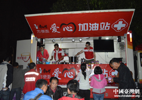 康師傅在蘆山縣設(shè)立“愛心加油站”現(xiàn)場為災民及救援人員提供烹煮好的熱泡面。(圖片來源:四川省臺辦)