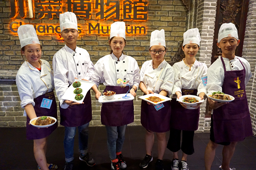 一進博物館,四川美食之都的淵源就呈現(xiàn)在同學們面前。作為世界唯一以菜系文化為陳列內(nèi)容的活態(tài)主題博物館,這里陳列著不少老四川的寶貝:戰(zhàn)國時期至今的3000多件川菜飲食器皿、與川菜有關的文字書籍和圖稿、全國最大的灶王祠、川菜與歷史文化名人背后的故事……川菜之魂——郫縣豆瓣的制作現(xiàn)場更是壯觀。上百口大缸整齊排列,揭開蓋子,濃郁的醬香撲鼻而來,赤紅的豆瓣讓人食欲大開。讓同學們在視覺、味覺上感受到川菜文化的博大精深與獨特魅力。