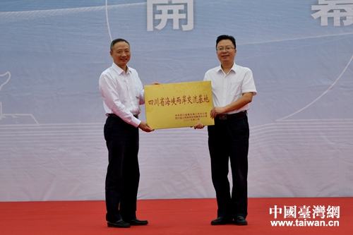 四川省臺(tái)辦主任周敏謙(左)為李莊鎮(zhèn)授牌