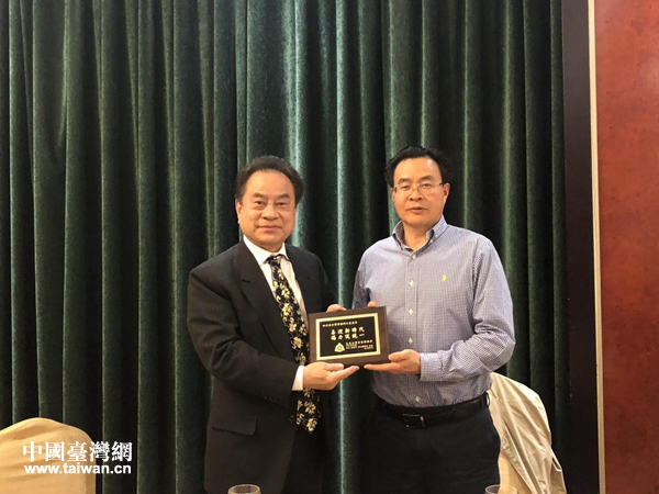 美東臺灣客家聯(lián)誼會會長陳達(dá)孝(左)贈送四川省臺辦、省臺聯(lián)“喜迎新時(shí)代,竭力促統(tǒng)一”牌匾。