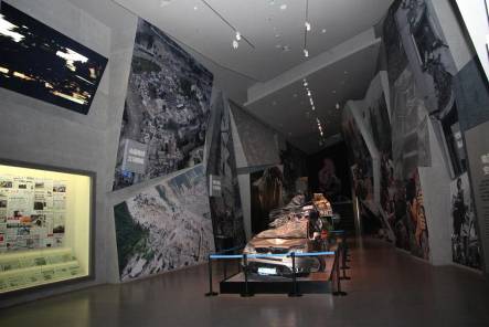 主館(地震紀(jì)念館)陳展面積10748平方米,總展線1900米。分為“序廳、曠世災(zāi)難破壞慘重、萬(wàn)眾一心抗震救災(zāi)、科學(xué)重建創(chuàng)造奇跡、偉大精神時(shí)代豐碑、結(jié)束語(yǔ)”六大板塊,于2013年5月面向社會(huì)公眾免費(fèi)開(kāi)放。