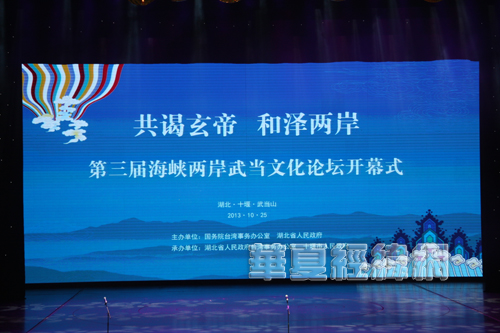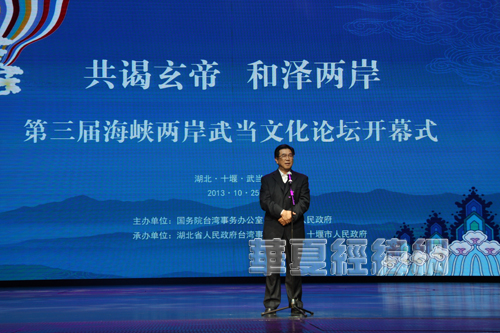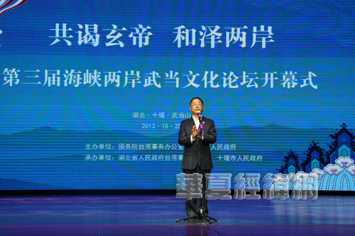 華夏經(jīng)緯網(wǎng)10月26日訊:25日晚,第三屆海峽兩岸武當(dāng)文化論壇在武當(dāng)山太極劇場(chǎng)舉行開幕儀式。出席開幕式的重要嘉賓有海峽兩岸關(guān)系協(xié)會(huì)副會(huì)長(zhǎng)蔣耀平、臺(tái)灣海峽交流基金會(huì)副董事長(zhǎng)高孔廉、湖北省第十屆政協(xié)副主席陳柏槐、中共十堰市委書記周霽。