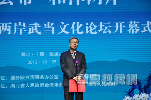 海峽兩岸關(guān)系協(xié)會(huì)副會(huì)長(zhǎng)蔣耀平代表國(guó)臺(tái)辦、海協(xié)會(huì)對(duì)第三屆海峽兩岸武當(dāng)文化論壇開幕表示祝賀!他表示,24日與海基會(huì)副董事長(zhǎng)高孔廉先生在武漢參加了“第十屆湖北·武漢臺(tái)灣周”的開幕式,今天又來到了武當(dāng)山參加海峽兩岸武當(dāng)文化論壇開幕式,體現(xiàn)了湖北與臺(tái)灣在經(jīng)貿(mào)、文化、人員交流方面出現(xiàn)了可喜局面。特別是隨著兩岸各方面努力,在經(jīng)貿(mào)方面實(shí)現(xiàn)了大合作;在文化交流方面實(shí)現(xiàn)了大交流;在人員往來方面實(shí)現(xiàn)了大往來。最后,蔣耀平預(yù)祝第三屆海峽兩岸武當(dāng)文化論壇取得圓滿成功!