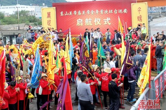 10月11日上午,東山關(guān)帝神像金身在兩岸信眾的簇?fù)硐,啟輦離廟,乘坐臺(tái)灣海盛航運(yùn)有限公司船只由東山港啟程赴臺(tái)巡安。東山各界舉行隆重的恭送儀式,兩岸信眾從關(guān)帝廟廟埕至東山港碼頭一路夾道跪拜禮送,到處是香燭、鞭炮、鼓樂(lè)、彩旗和藝陣,場(chǎng)面熱鬧非凡。