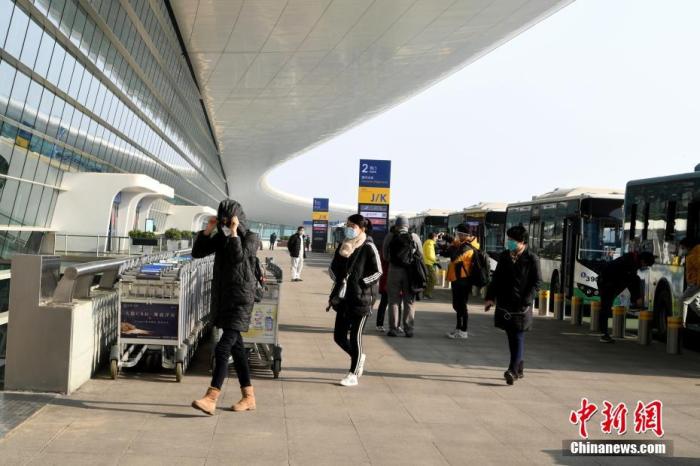 2月3日,首批約200名滯留武漢的臺(tái)胞乘坐上海航空公司的民航包機(jī)返臺(tái)。圖為臺(tái)胞抵達(dá)武漢天河國(guó)際機(jī)場(chǎng)準(zhǔn)備乘機(jī)。
