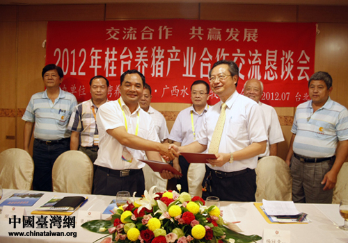 中國臺灣網7月27日臺北消息 7月26日,廣西水產畜牧業協會和臺灣養豬協會在臺北共同簽訂《關于促進桂臺養豬業交流合作備忘錄》,雙方將致力于推進桂臺兩地的畜牧業交流互助合作。