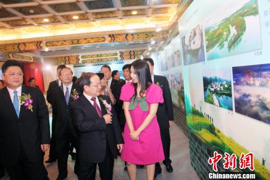 8月21日,“江西旅游風光展”在臺北開幕。作為臺灣江西周一部分,展覽以精美的圖片向臺灣民眾介紹江西特有的風光,期待贛臺兩地民眾互訪旅游。圖為江西省長鹿心社與其他嘉賓一起參觀展覽。黃少華攝