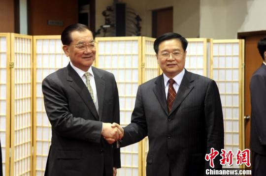 5月7日下午,湖北省代表團來臺參訪抵達桃園機場。部分成員隨后即前往國民黨智庫,會見中國國民黨榮譽主席連戰等。圖為中國國民黨榮譽主席連戰(左)會見湖北省省長王國生。陳立宇 攝