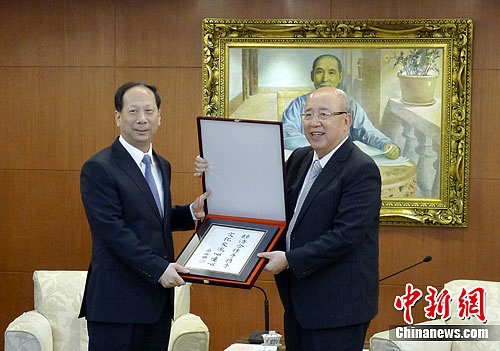 江蘇省委副書記石泰峰5月22日率該省代表團抵達臺北,前往中國國民黨中央黨部拜會吳伯雄。據悉,此次是繼2009年之后,該省第二次在臺灣舉辦“江蘇周”活動。圖為吳伯雄向石泰峰贈送寫有“經濟合作手攜手,文化交流心連心”的書法作品。中新社發 杜燕 攝