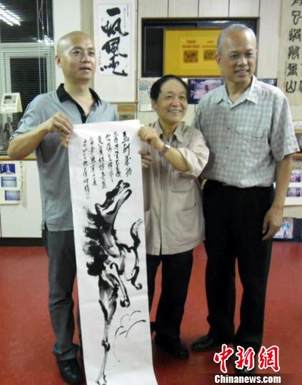 圖為臺灣畫家秦仲璋(中)向何秉華致贈“馬到成功”的畫作。陳立宇 攝