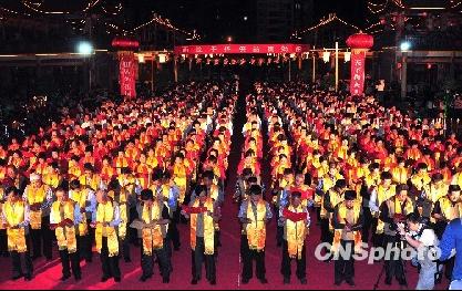祭典結(jié)束后,一千名兩岸信眾代表整齊排列在懿明樓廣場(chǎng),身披綬帶,同聲朗頌《湄洲媽祖金身巡安興化頌文》、同唱《媽祖之光》。在祭典上,由兩岸共同舉辦的“兩岸千燈迎媽祖”、“兩岸千人頌媽祖”、“兩岸千品貢媽祖”等活動(dòng),尤為引人注目和稱道。