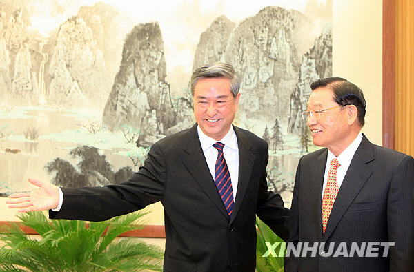 10月28日,中共中央政治局常委、全國政協主席賈慶林在北京人民大會堂會見臺灣海基會董事長江丙坤率領的海基會新聞交流團一行。新華社記者 饒愛民 攝