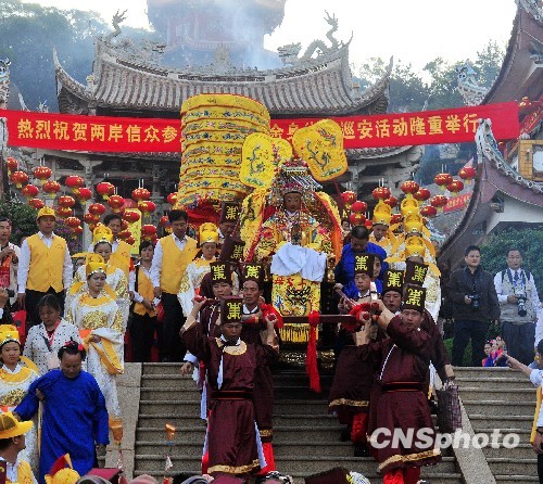 中新社湄洲島十一日二日電 (詹托榮)今天上午,湄洲媽祖金身開始在“媽祖故鄉”福建莆田繞境巡安,臺灣鹿港天后宮媽祖神像隨駕參加,世界各地文化機構、信眾代表和當地群眾數萬人或護駕、或沿路朝拜,隊伍浩大、場面壯觀。