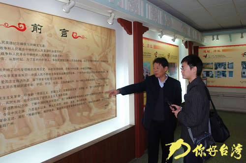 廣州中山紀念堂管理處錢曉清書記向本網(wǎng)記者介紹圖片展情況(你好臺灣網(wǎng) 黃永波 鐘智躍 攝)