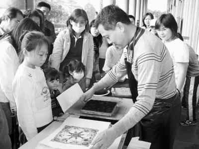 和善的馬習欽教得特別認真。他先給練習制作的孩子系上圍裙,然后教他們對版、套版、刷版,爾后,一張色彩明亮、透著喜氣的胖娃娃年畫就這樣印出來了。孩子們學得興致勃勃,也吸引了一些大人前來一試身手。