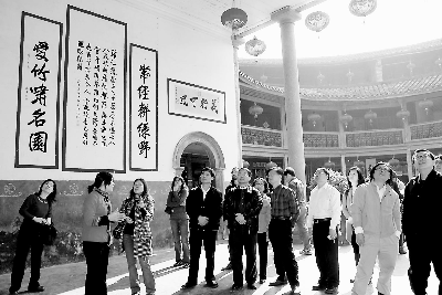 東南網(wǎng)-福建日?qǐng)?bào)2月1日訊(劉永良 文/圖) 1月29日至30日,以臺(tái)灣大學(xué)客家研究中心主任邱榮舉為團(tuán)長(zhǎng)的“客家學(xué)與兩岸發(fā)展研究團(tuán)”一行18人到永定考察了世界遺產(chǎn)福建(永定)土樓(如圖)、胡文虎紀(jì)念館,還與永定縣相關(guān)部門舉行“永臺(tái)客家文化交流座談會(huì)”,就兩岸客家文化的發(fā)展現(xiàn)狀、永臺(tái)客家關(guān)系、土樓文化、推進(jìn)永臺(tái)客家文化交流合作等專題進(jìn)行交流研討。