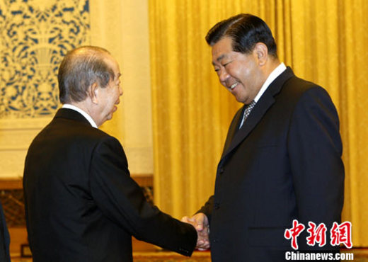 9月15日,中共中央政治局常委、全國政協(xié)主席賈慶林在北京人民大會堂會見了臺灣奇美文化基金會董事長許文龍一行。中新社記者 盛佳鵬 攝