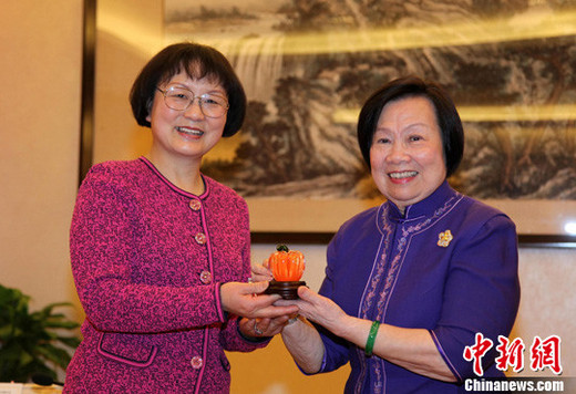 3月22日上午,正在臺北參訪的上海婦女代表團來到臺灣婦聯會辦公樓,拜會了海基會已故前董事長辜振甫的遺孀、臺婦聯會主委辜嚴倬云女士。圖為辜嚴倬云(右)向張麗麗(左)贈送南瓜造型工藝品。中新社發 符永康 攝