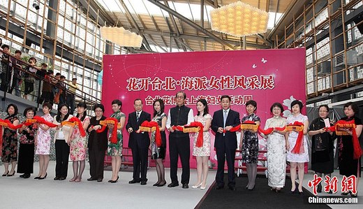3月21日下午,由上海市婦女聯合會主辦的“花開臺北·海派女性風采展”在臺北開幕,滬上112位杰出女性代表身著各式旗袍亮相花博會流行館,觀看“都市光影中的她”攝影展及特色演出,并與相聚在此的臺灣婦女會總會姐妹們暢敘友情。圖為中共上海市委常委、宣傳部部長楊振武(右十),上海市婦聯主席張麗麗(右四)等共同為展覽剪彩。中新社發 符永康 攝