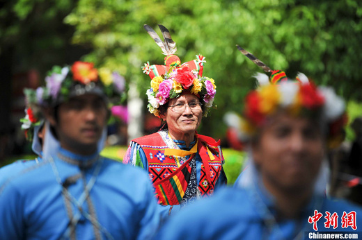 4月30日,2011中國(guó)昆明國(guó)際文化旅游節(jié)昆明狂歡節(jié)在春城昆明開(kāi)幕。來(lái)自寶島臺(tái)灣的原住民族原舞者表演隊(duì)精彩亮相,受到游客的喜愛(ài)。中新社發(fā) 劉冉陽(yáng) 攝