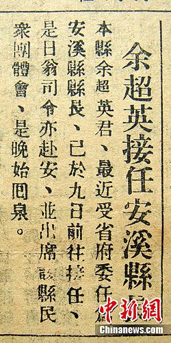 在這份民國二十三年(1934年)1月13日的《崇道報》上,刊載著這則《余超英接任安溪縣長》的消息:“本縣余超英君,最近受省府委任為安溪縣縣長,已于九日前往接任”。