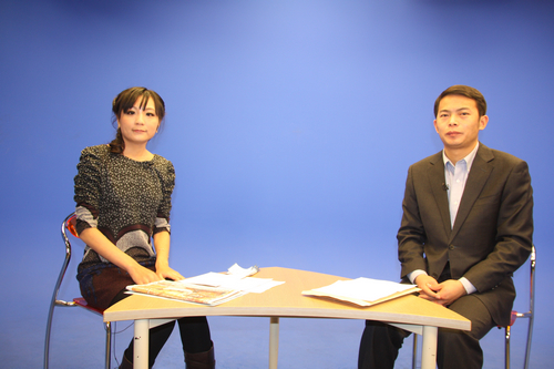 中國宋慶齡基金會聯絡部臺灣處李章程和中國臺灣網主持人董潔在節目錄制現場。(中國臺灣網 段富兵 攝)