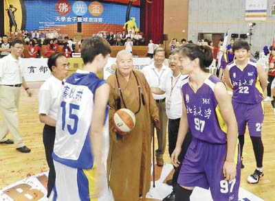 據(jù)臺灣《旺報》報道,2012年佛光杯大學女子籃球邀請賽,海峽兩岸各4所大學共8支球隊,4日起在宜蘭佛光大學懷恩堂開打。開幕典禮中,佛光山創(chuàng)辦人星云大師勉勵所有參賽者,從打球中學習做人,從球賽中學到做人的修養(yǎng)。